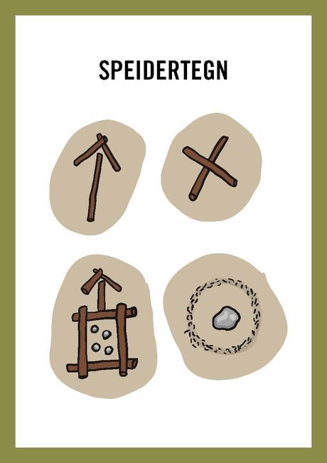 Kortene som hører til dette møtet: Illustrasjoner av sportegn eller speidertegn. Tegnene betyr: En pil - Gå i denne retningen. Et kryss - Ikke gå her. En firkant med stener inni og en pil - Gå så mange skritt i denne reningen enten for å finne neste tegn eller en beskjed. Sirkel med stein i - Gå hjem. Tegnene kan lages av pinner og steiner slik de er tegnet på kortet eller de kan lages av alt man finner i naturen. De andre kortene inneholder illustrasjoner av ulike insekter, fugler og trær.