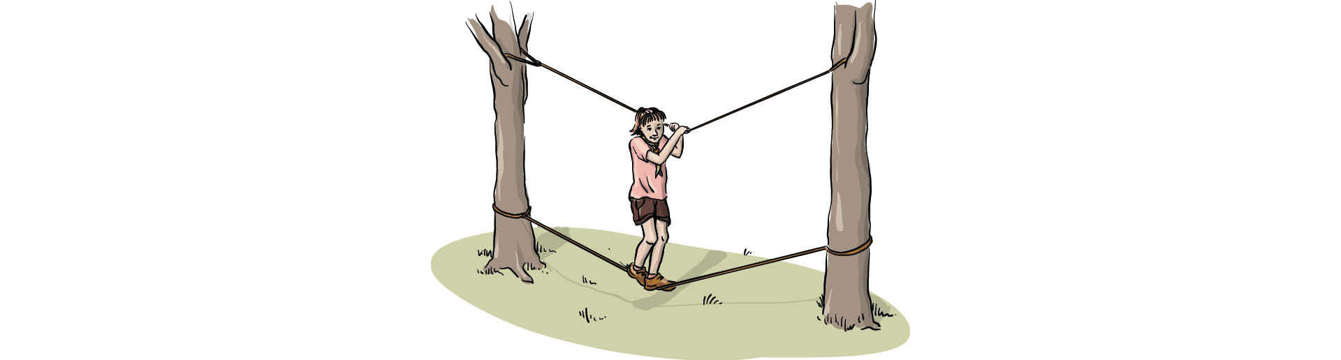 - Stå på det nederste tauet, ta tak i det øverste og gå sidelengs over broen. Ofte må broen strammes litt etter hvert som tauet strekker seg.
