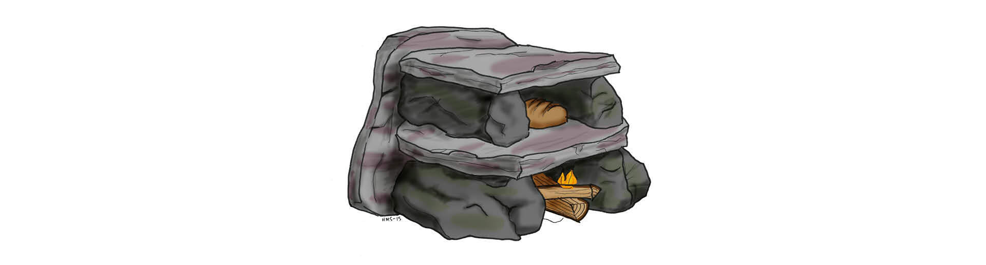 - Bygg en ovn med bunn, vegger og tak av steinheller. Plasser en flat stein i midten til stekehelle.