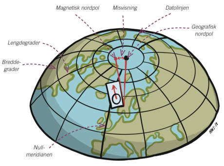 Vinkelforskjellen mellom geografisk og magnetisk nord kalles misvisning. Misvisningen varierer etter hvor du er, og står som regel oppgitt i kartrammen på kartet. Når du skal korrigere for misvisning legger du til eller trekker du fra misvisningen.