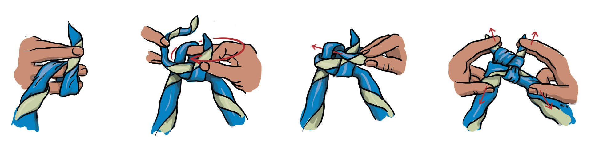 - Stram alle endene jevnt sånn at de fire delene i knuten blir like lange.